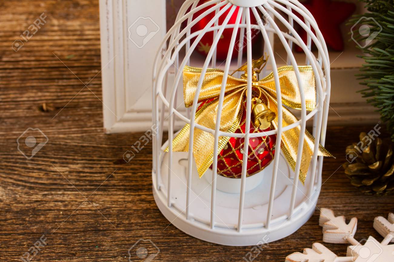 Immagini Stock Decorazioni Di Natale Retro Con Gabbia Per Uccelli Su Legno Image 45958332